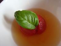 野菜ブイヨンのスープに湯むきしたトマトを加え、少し火を通した後、冷まします。