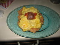 オムライスです。ライスは炊き立てのご飯にケチャップと炒めた野菜を入れて混ぜます。ご飯を炒めないのでカロリーダウンできます。