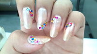 ゴールドベージュのマニキュアのベースを作ってその上にカラフルなストーンを置きました(^o^)/