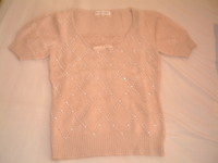 オフホワイトの半そでニット。袖がレースになっています。真冬には寒いので、秋に活躍です。