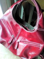 肩から下げる赤いバッグ