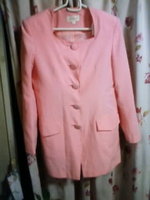 いかにも春色といったピンクのスーツです。襟ぐりがスクエアになっていてスッキリしているので、気に入っています。
