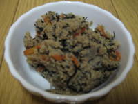 人参、ねぎ、戻したひじきを出汁、醤油、砂糖で少し煮たら、おからを入れて炒め煮にします。