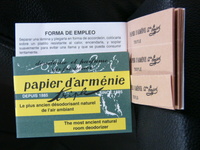 今最も気に入っているアロマグッズです。紙のお香で、燃やして使うのですが、本や鞄の中にいれてもよいそうです。ほんのりバニラの香りがします。締め切った部屋や匂いをすっきりさせるとのこと。私は寝る前と起きたときの一日二回たいています。空気を浄化するお香なので、かなりリフレッシュできます。これは人にすすめたい一品。