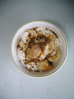 作り方は、バナナを適当に切って、ヨーグルト、そしてきなこ(私は健康によさそうなので、黒豆きなこをかけてます)をかけるだけ…。