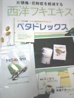 ![]() ![]() レビュー サプリ・フード ペタドレックス 2007/4/1 (日) 23:38 評価:★★★☆☆☆☆ ![]() ペタドレックス 偏頭痛・花粉症に効果があるサプリメントとのことで キレイナビさんのモニター応募で入手しました。 開封すると、西洋フキエキスの匂いが・・ 漂ってきます。 黄色のソフトタイプなぷっくり小粒カプセル 頭痛がある時飲んでみました。 開封した時、におう事だけあって 胃に入った後も多少フキの味が感じられます。 普段飲んでいるサプリメント類は 無臭系なので...ちょっと違和感。ありでした。 体質などにより個人差があると思いますが、 私は摂取後3時間経たない間に痛みがやわらぎ 少しは効果があったような気がします〜♪ コメント(0) 健康系サプリメントその他 ペタドレックス 頭痛・偏頭痛 戻る キレイナビ![]() |