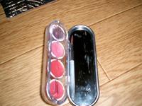 ![]() ![]() レビュー コスメ キャンディリップ 2006/8/27 (日) 19:08 ゅき☆ 評価:★★★★☆☆☆ ![]() ダイソーの商品です。 3色くらい合ったと思います。 私が持っているのは、ストロベリーピンクです。 4色入っていて、そのうちの1つはグロスです。少しラメが入っていますが、使いません。 私は基本的に口紅は使わないんですが、これは、薄付きで好きなんです。あと、中には鏡がついていますが、全体は移せないので使っていません。 それよりも付属のブラシ(筆)が凄い良いです!!こんな良いのは初めてだと思いました。とても100円の口紅の付属とは考えにくいです。 ぱっと身は子供の玩具とか思ってしまいました^^; 唇が少し剥けることもありますが、私はほとんどがそうなるので全然問題がないですね^^ コメント(0) 口紅 発色がいい 戻る キレイナビ![]() |